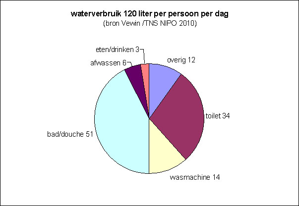 Regenwater kan worden gebruikt ter vervanging van circa 50 % van uw drinkwaterverbruik. Het rechterdeel van de grafiek, namelijk toilet, wasmachine en een gedeelte van het overige verbruik, zoals planten water geven, autowassen enz. Ook voor utiliteitsgebouwen zijn aanzienlijke besparingen mogelijk als regenwater wordt gebruikt voor toiletspoeling