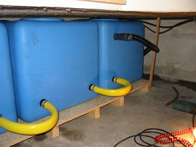 In dit geval waar een lage kelder aanwezig is konden 3 tanks van elk 200 liter binnenshuis worden geplaatst.