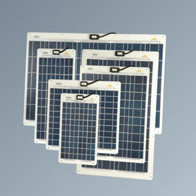 Een alternatief voor grote, starre en niet flexibele glasmodulen. Deze modulen uit RVS zijn kleiner, makkelijk te buigen, zeer dun en licht. Vlak gelijmd of geschroefd zijn de modulen beloopbaar en voegen zij zich naar licht gekromde oppervlakken. (maximale kromming 3 cm per meter). Door de kunststof bovenzijde kan geen glasbreuk optreden. Deze zonnepanelen met cellen uit de ruimtevaarttechniek hebben een zeer hoog rendement. Door de toepassing van 40 cellen per paneel kan ook bij hoge temperaturen een accu vol worden geladen.De panelen zijn voorzien van een solide aansluiting met 3 m kabel. Voor toevoeging aan een bestaande accu-installatie is alleen nog een overlaadregelaar nodig. Bijvoorbeeld de SunGuard 4 (volledig waterdicht) geschikt voor alle typen (zie onder regelaars). Ook kan voor de zwaardere typen de toepassing van een MPPT regelaar worden overwogen om het maximale rendement uit de panelen te halen.