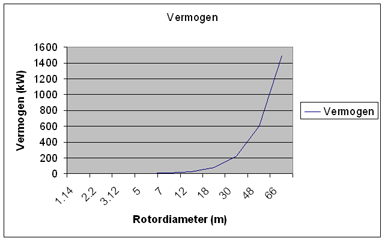 Uit bovenstaande figuur blijkt dat een verdubbeling van de rotordiameter circa 4 x zo veel vermogen geeft. Dat is een van de redenen waarom er steeds grotere molens worden gebouwd. Een grote molen levert relatief veel meer vermogen. Deze grotere molens leveren de opgewekte energie direct aan het elektriciteitsnet.. Deze molens zijn relatief duur en de plaatsing vereist vergunningen. Het plaatsten van dit soort molens kan financieel interessant zijn. Wij adviseren u graag over de mogelijkheden.